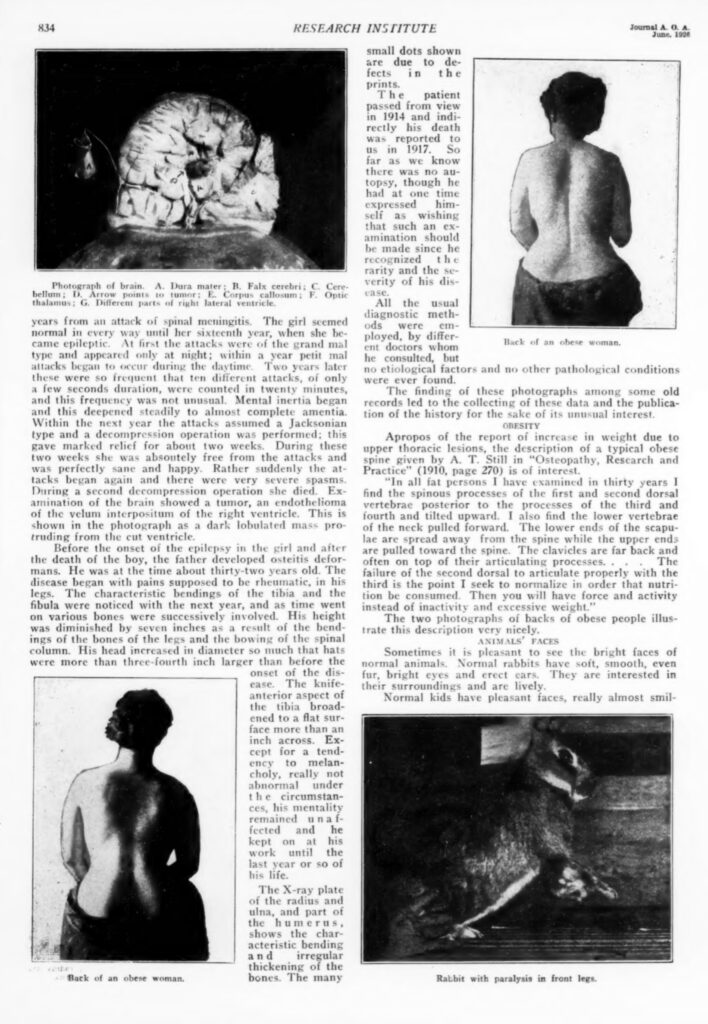 27. LOUISA BURNS, M.S., D.O.. 1925. Secondary lesions following experimental lesion of the second thoracic vertebra in rabbits. JAOA vol. 24 (5).