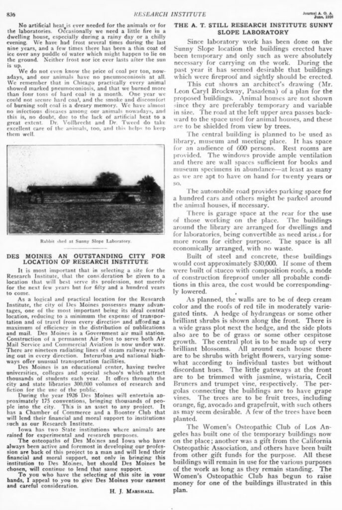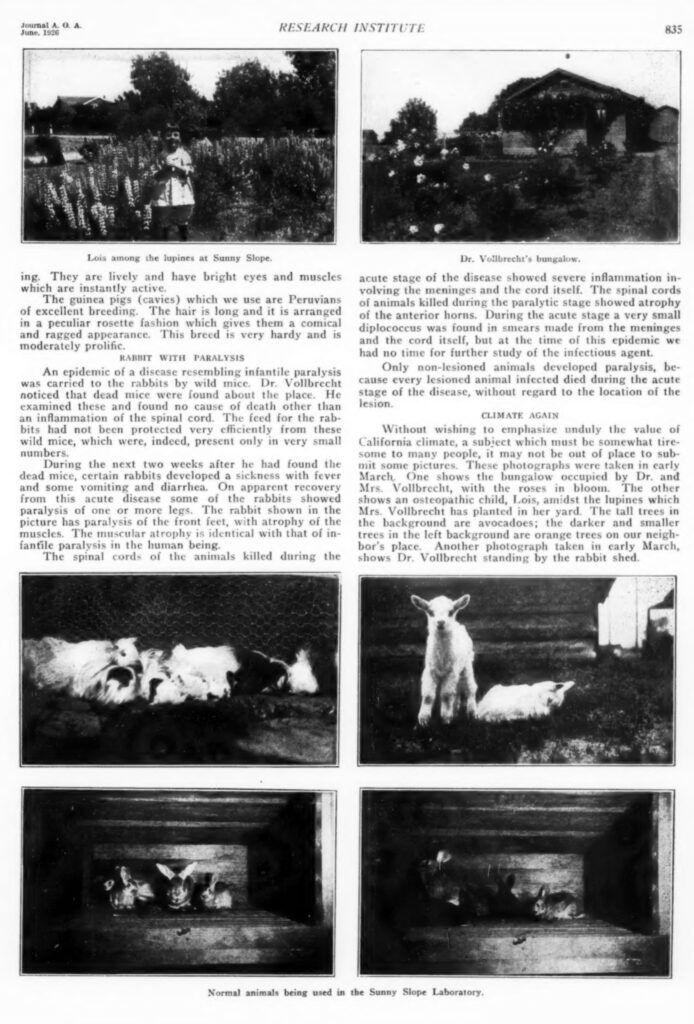 L’article qui suit rend compte de l’état des recherches menées à Sunny Slope en 1926, ainsi que des conditions expérimentales de l’époque. Une partie des fonctions de la Dr Burns consistait à superviser une vingtaine de médecins ostéopathes qui l’assistaient dans ses travaux, ainsi qu’un certain nombre d’étudiants chargés de la gestion des dossiers.