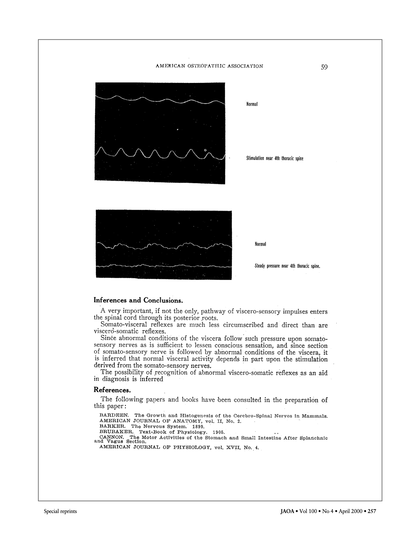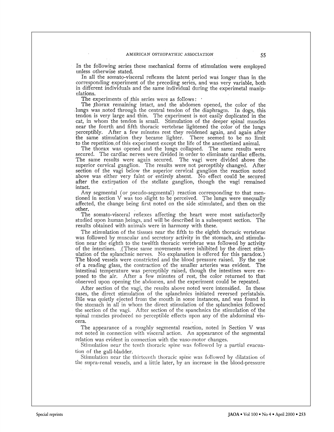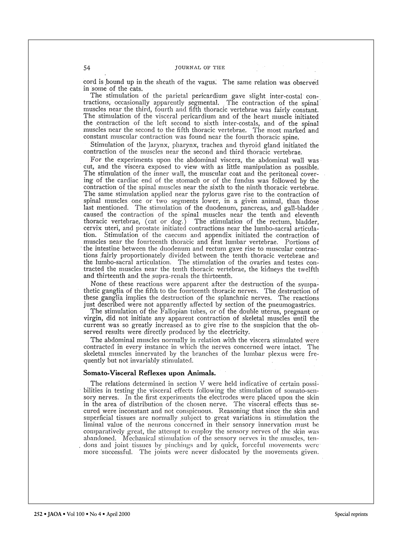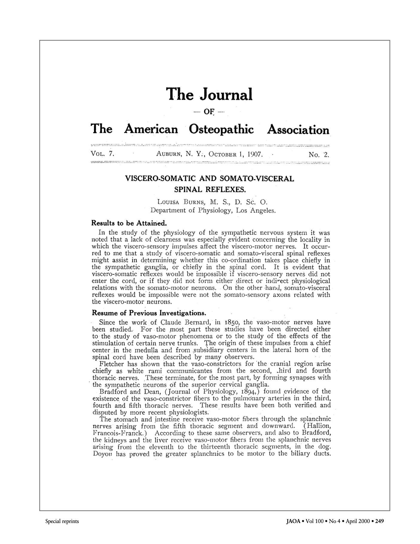 C’est ainsi qu’en octobre 1907, après sa première apparition dans la revue professionnelle de l’époque, le Journal of the American Osteopathic Association (JAOA), sera publié l’article Viscero-somatic and somato-visceral spinal reflex